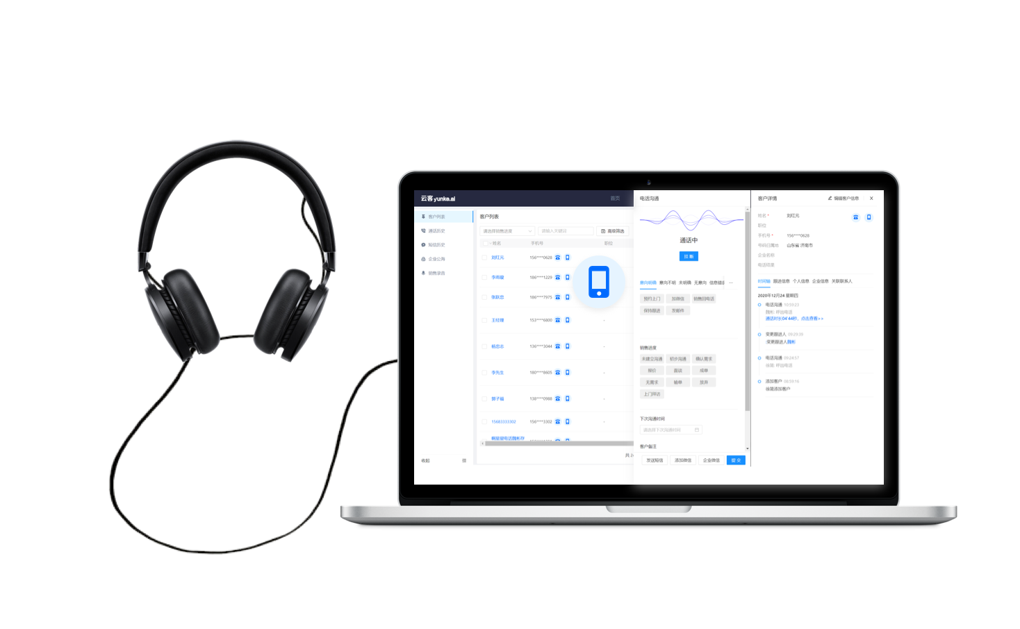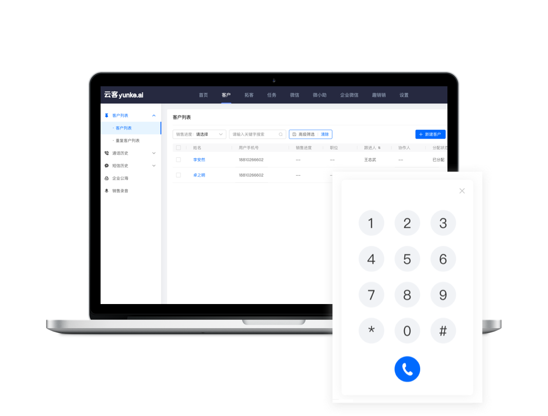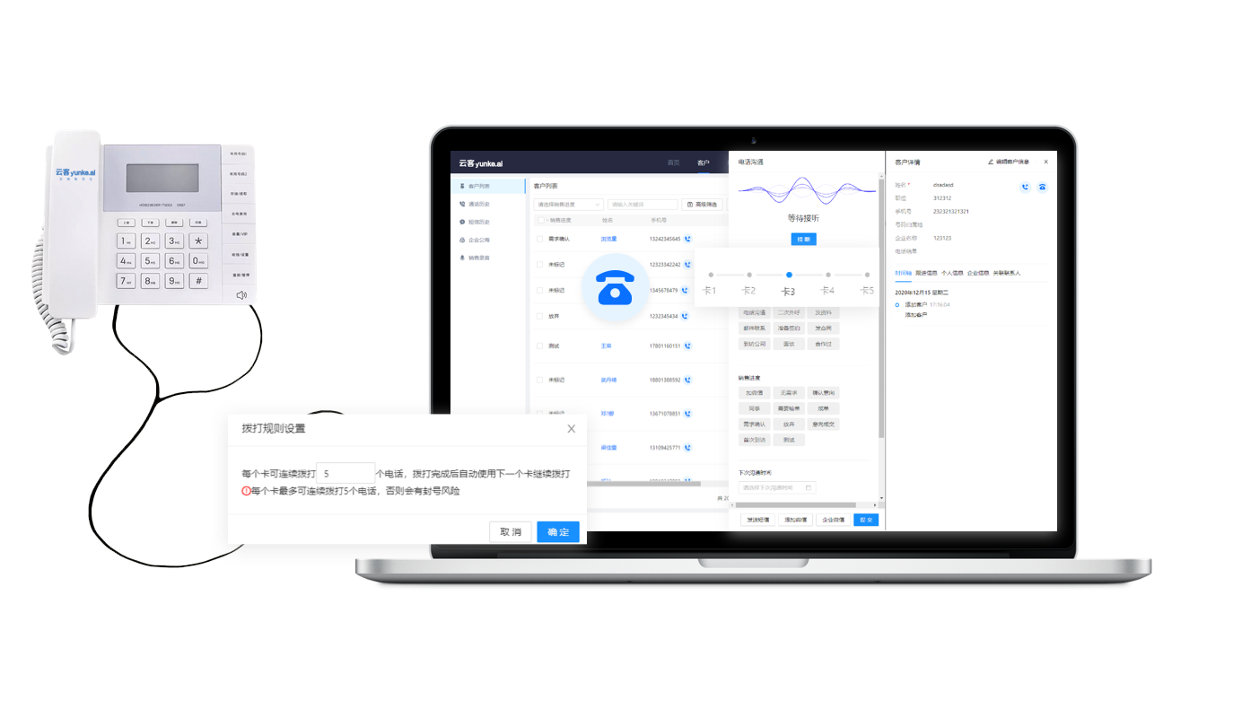同时支持电脑端和安卓手机端呼叫,支持客户回拨。可使用专属话机,也可以使用自己的手机外呼。