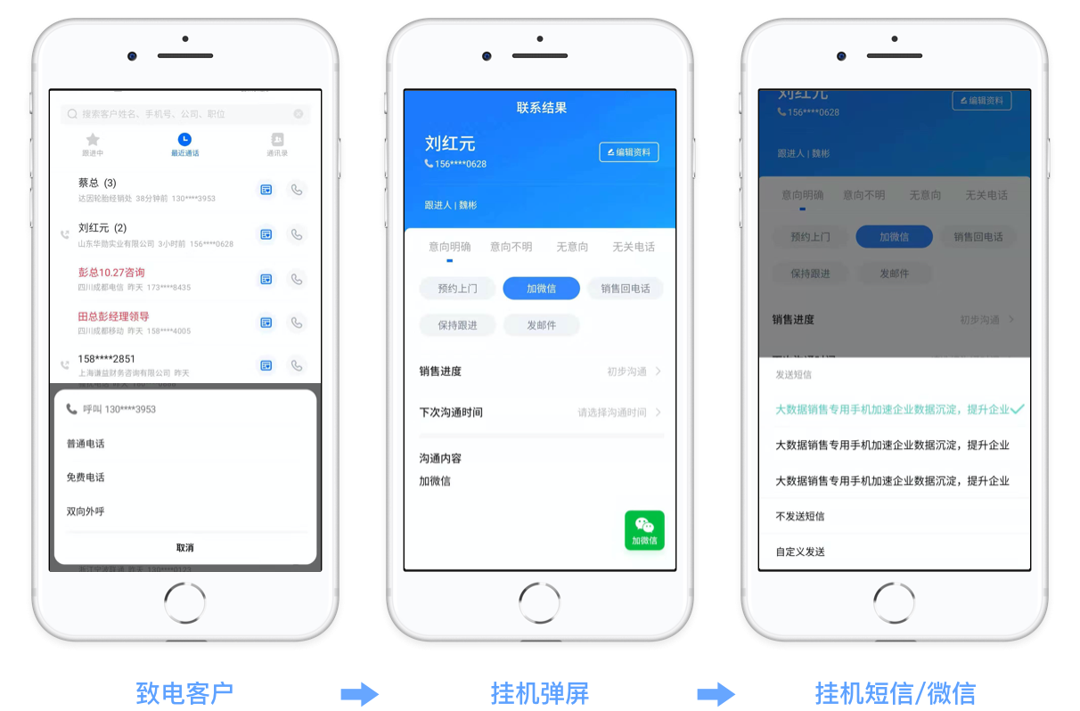 挂机后一键点击,自动发短信/加微信/发邮件。